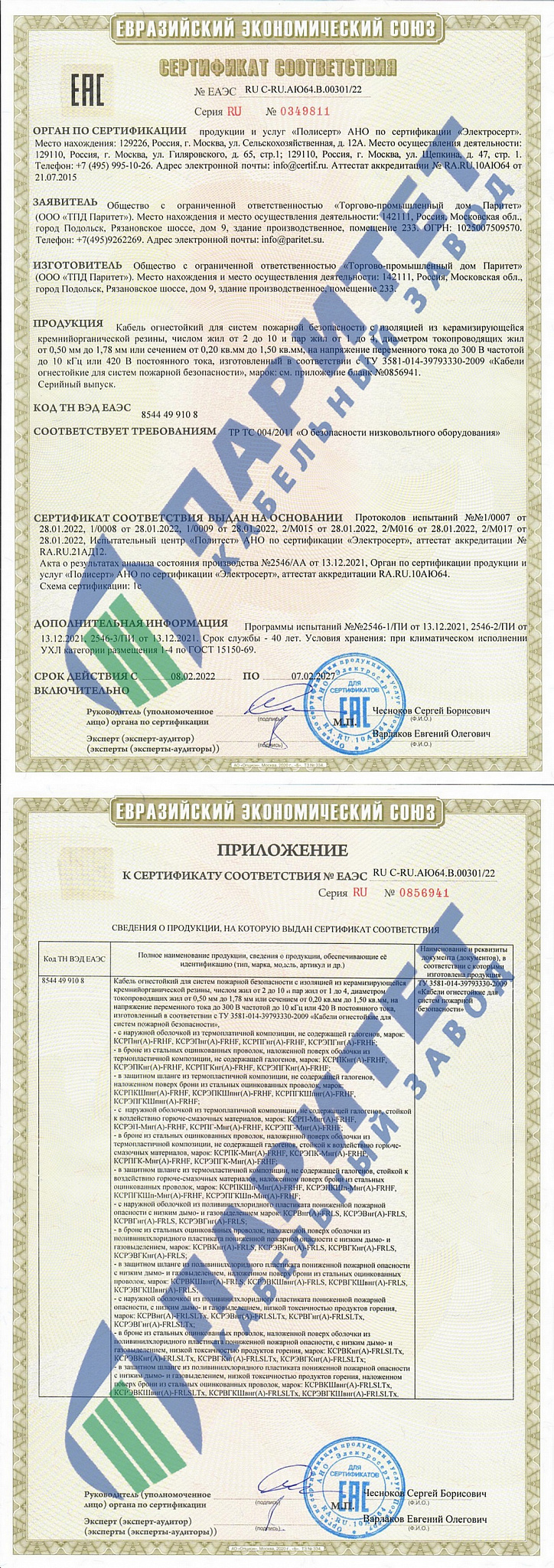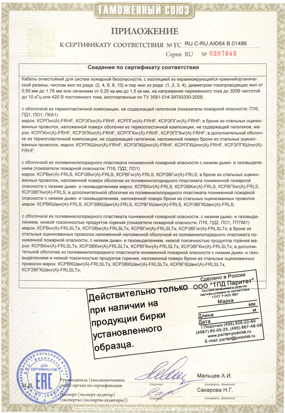 • Предел огнестойкости кабеля в условиях воздействия пламени Мин - не менее 180 (ГОСТ Р МЭК 60331-23-2003)