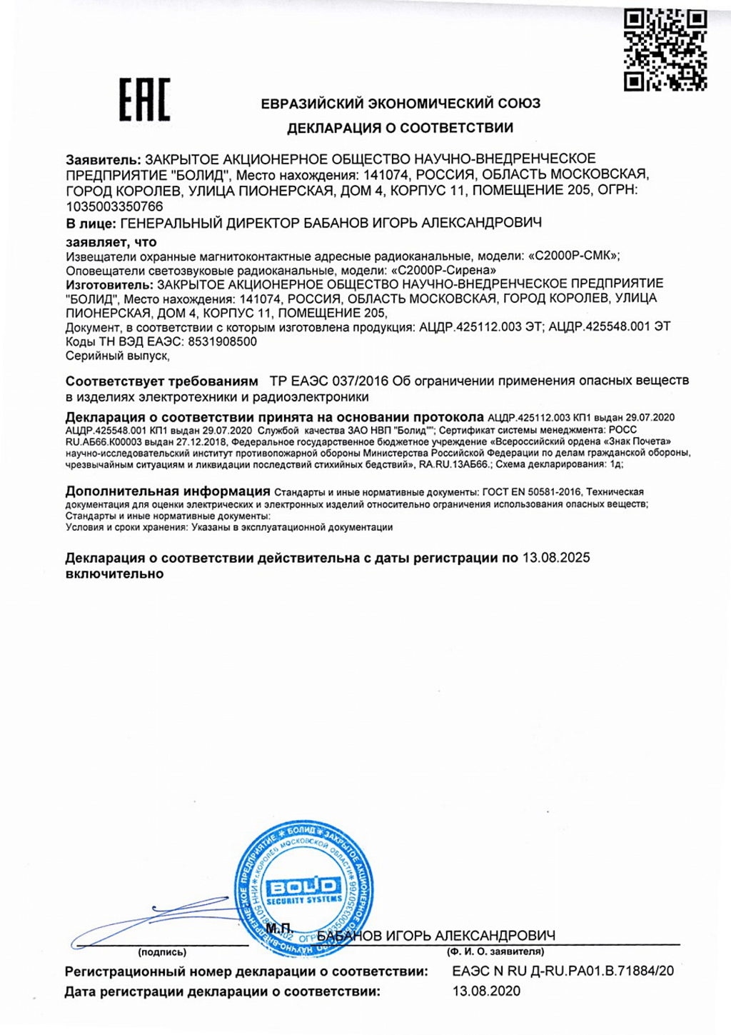 С-2000Р-Сирена используется в системах охранно-пожарной сигнализации и автоматического пожаротушения, предназначен для светового и звукового оповещения людей о пожарных, охранных тревогах и прочих чрезвычайных событиях. Прибор используется совместно с расширителем "С2000Р-АРР32", "С2000Р-АРР125". Особенности прибора: оповещатель рассчитан на непрерывную круглосуточную работу и относится к восстанавливаемым, периодически обслуживаемым изделиям; оповещатель имеет встроенные основной и резервный заменяемые источники питания; оповещатель позволяет независимо управлять световым и звуковым оповещением и т.д. В оповещателе осуществляется контроль вскрытия корпуса. Оповещатель рассчитан на установку внутри и вне помещений, внутри закрытых неотапливаемых помещений.