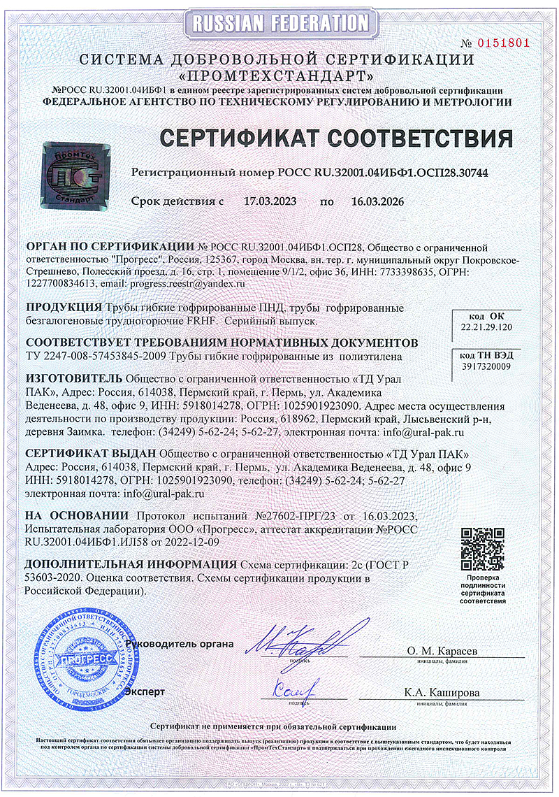 Материал ПНД (полиэтилен низкого давления) является экологически чистым и позволяет монтировать изделия, выдерживая широкий температурный диапазон без изменения механических и изоляционных свойств. Гофрированная труба из ПНД обладает устойчивостью к воздействию влаги, обладает повышенной эластичностью, что облегчает монтажные работы.