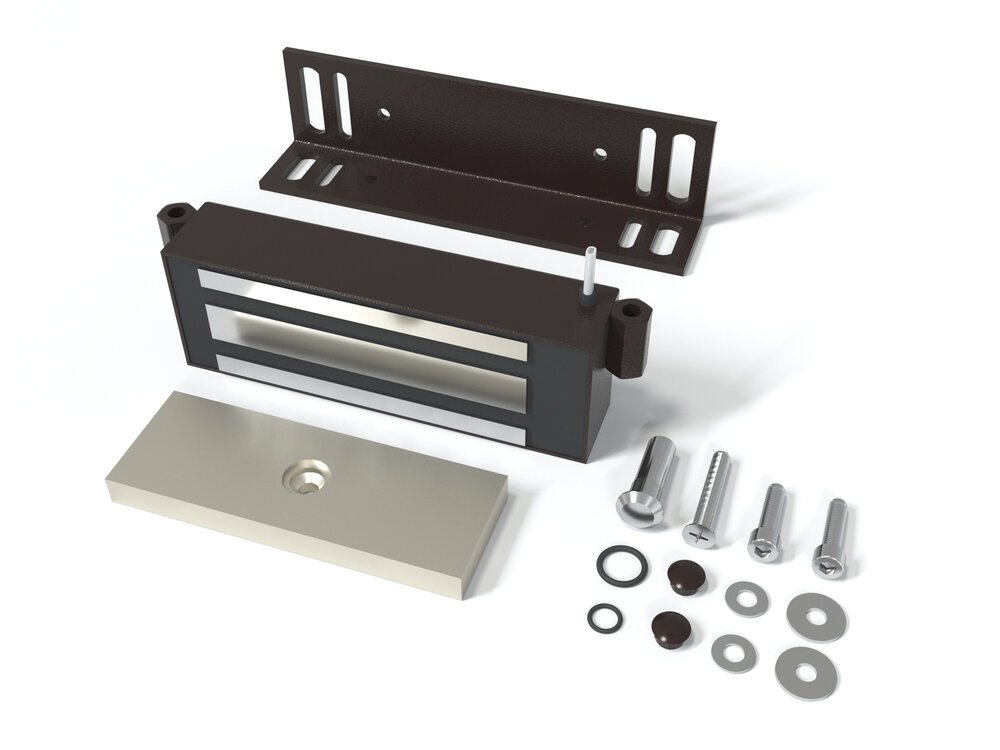 Замок электромагнитный для стальных дверей со стальной рамой, сила удержания 300кг, 9-15VDC, 0,6А, 7,2 Вт, встроенный модуль перемагничивания, монтажный комплект, уголок 40х50х4мм. Корпус из стали. -40…+45°C. Цвет корпуса (CB)- коричневый шоколад, магнит: 120х48х35 мм, пластина: 125х45х11,2 мм.